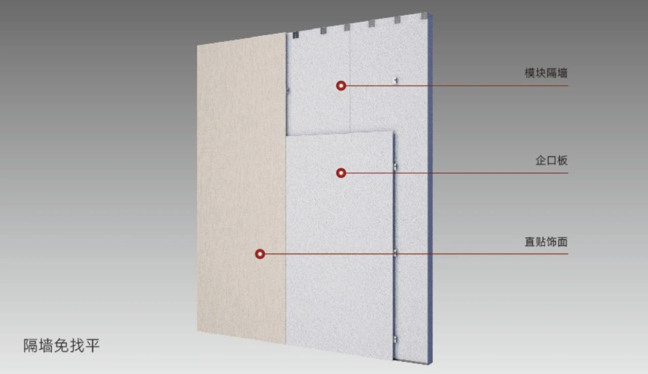 其中,墻面找平系統(tǒng)應用于隔墻與建筑墻體找平,該技術是一種模擬結構墻體干法快速找平工藝的技術。工廠標準化生產(chǎn)的隔墻精度、平整度高,無需找平,可實現(xiàn)壁布直貼、壁紙修縫,以及板材類直鋪。針對建筑墻體找平,可通過調(diào)平龍骨+企口板,找平簡單,平整度高,同樣可實現(xiàn)壁布直貼、壁紙修縫,以及板材類直鋪。