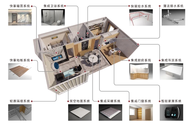 和能裝配式裝修智能建造技術(shù)通過工業(yè)化生產(chǎn)的方式把獨立出來的內(nèi)裝修轉(zhuǎn)化為可批量生產(chǎn)的部品,并且通過連接構(gòu)造設(shè)計實現(xiàn)現(xiàn)場裝配。具體包括全屋部品體系,即快裝墻面系統(tǒng)、快裝給水系統(tǒng)、薄法排水系統(tǒng)、集成衛(wèi)浴系統(tǒng)、套裝門窗系統(tǒng)、集成吊頂系統(tǒng)、輕質(zhì)隔墻系統(tǒng)、快裝地板系統(tǒng)、架空地面系統(tǒng)、集成采暖系統(tǒng)、集成廚房系統(tǒng)、智能家居系統(tǒng)。
